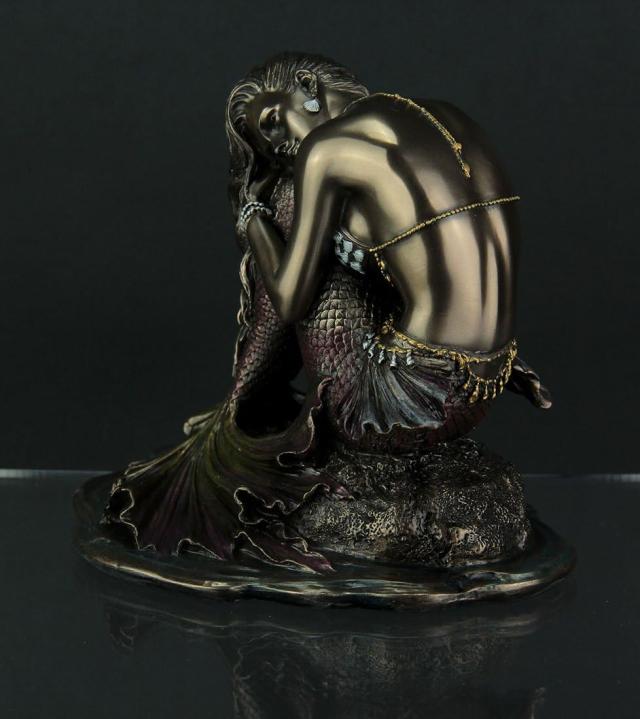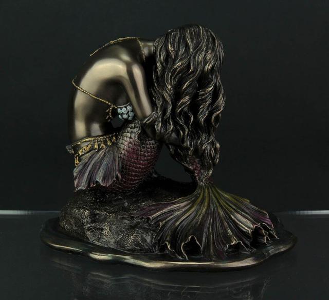この見事なコールドキャスト樹脂の彫像は、岩の上に腰掛け、両腕で尻尾を抱きかかえる、孤独な表情の人魚を描いています。