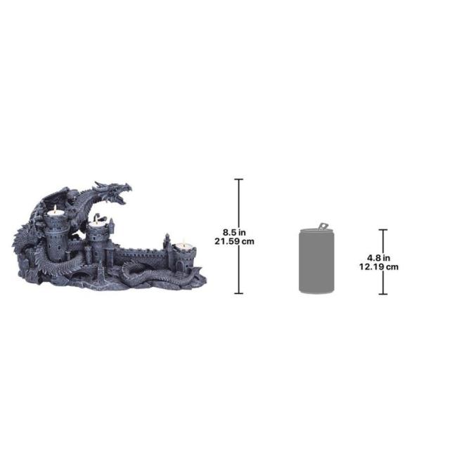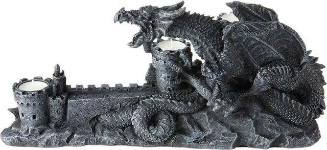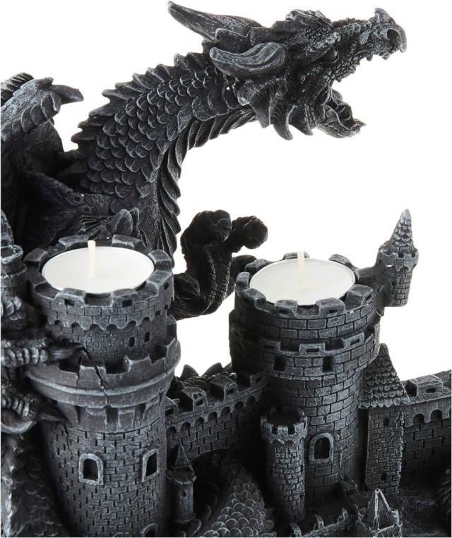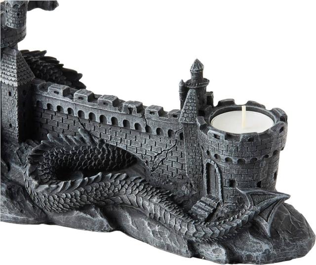 この素晴らしく、デザインされた彫刻では、レンガ、石、砲塔の紋章が中世のドラマとともに展示されています。 アーティストのゲイリー・チャンの見事なドラゴンの彫像は、高品質のデザイナーレジンによって、跳ね橋から堀まで、とげのある尻尾を広げて怒りを示しています。 この装飾芸術の作品としてだけでも魅力的で、ティーライトに照らされるとさらに魅力的です。 火のついたろうそくを、放置しないでください。