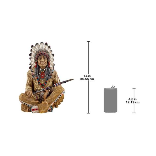 アーティストは、平和のパイプを保ち、精神の強さと、ネイティブ アメリカンの酋長の、西部開拓時代の彫像に、敬意を表しています。鷲の羽冠やビーズ付きのバックスキンのズボンまで、1 つのディテールも無視されていません。博物館品質のデザイナーレジンで鋳造されたこのネイティブアメリカンの像は、日焼けした肌から手縫いのモカシン(鹿革製のかかとのない靴)まで、あらゆる風合いを強調するために、自然な色で細心の注意を払って手描きされています。