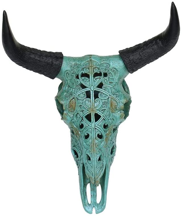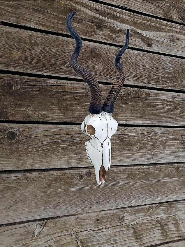 信じられないほどのリアルさを備えた、硬くて耐久性のあるポリレジン素材で作られています。背面のメタルブラケットにより、簡単かつ確実に取り付けられます。 頭骸骨と2本の角の3ピース構造。角は頭蓋骨の上の柱に簡単に取り付けられます。