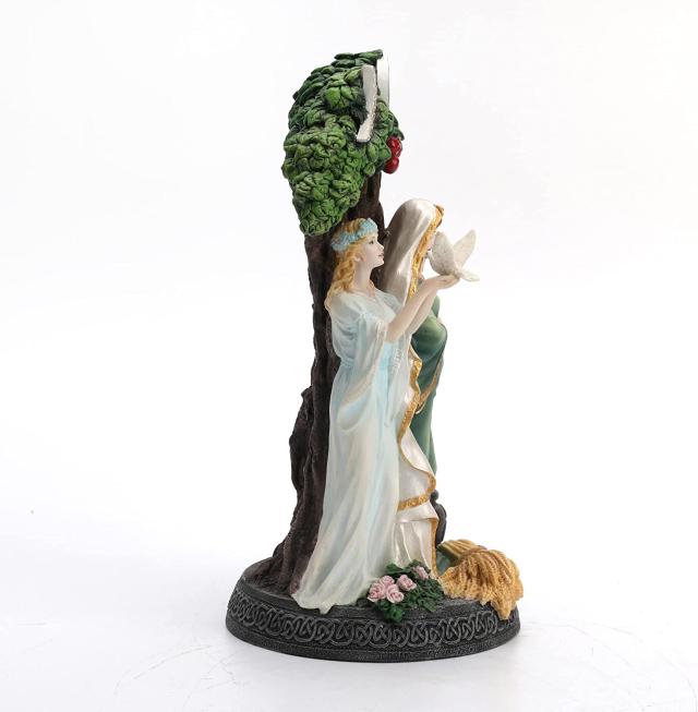 ヴェロネーゼ製のケルト三女神の乙女、母と老婆の彫像。 女神のモデルは、3つの形に分かれています。乙女、母親、老婆が、ケルト模様の黒い台座に立っています。 3人の女神が、木の前に立ち、それぞれの月の満ち欠けが頭上に現れています。青く着色された鳩を抱えた乙女は、彼女の前にピンクの花畑で、若々しさと新鮮な始まりを表しています。緑のドレスに身を包んだ妊娠中の母親は、親子関係を象徴し、目の前に置かれた、黄色い麦束と赤い果物が育っています。白いフクロウを連れた老婆は、黒いローブで彩られ、知恵と死を示し、黒い大釜を持っています。ケルトのシンボルが、豊富で印象的な必需品として、自然宗教に興味のある方に最適です。この彫刻は、ポリウレタン樹脂で構成され、粉末の石の添加物と混合されたポリストーンで鋳造され、重量が増し、磁器または「石のような」形状を感じられます。ポリストーンは非常に耐久性があり、他の一般的な素材よりも元の彫刻をよりきれいに表現できます。