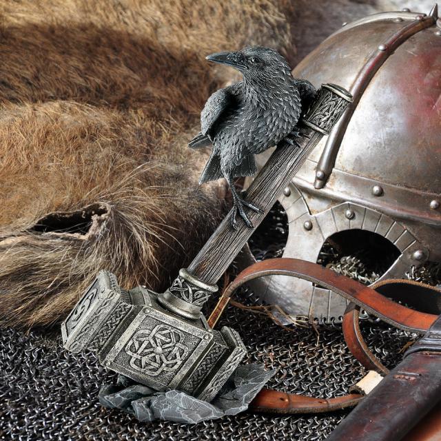 北欧の雷神の選ばれた武器である強力なハンマー 「ムジュルニル」は、バイキングの破壊的な武器として、また祝福の神聖な道具として使用されました。この北欧の力の象徴は、合成木のハンドルの木目から合成金具を飾る古代のデザインに至るまで細部まで彫刻されており、高品質のデザイナーレジンで鋳造され、フルカラーで手描きされています。恐れ知らずと決意の象徴である、戦士雷神の大槌の上に鎮座する精霊の導きの守護者レイヴン「ワタリガラス」は、その強さをさらに証明しています。