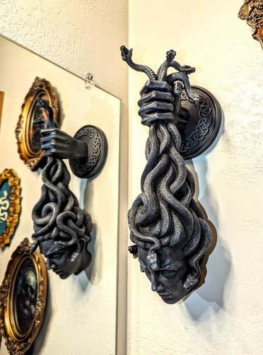 メデューサはゴルゴン姉妹の一人で、アテナによって怪物に変えられました。かつては美しかった金色の巻き毛は、進化し続ける毒蛇に変わりました。 彼女の愛しい目は血走り、定命の者の魂を見つめてそれらを石に変えます。メドゥーサの運命は、アテナの磨かれた盾とヘルメスの翼のあるサンダルで、彼女を倒したペルセウスの手によって決定されました。この彫刻は、不気味であり、同時に魅惑的です。ペルセウスの手がケルトの結び目で作られた丸い盾から突き出ており、メドゥーサの蛇の毛の束を掴んでいます。メドゥーサは目を閉じ、アテナに呪われて以来初めて穏やかで平和な表情を浮かべました。彼女の髪の生え際の蛇は依然として獰猛で、シューシューと音を立てて牙を剥いています。彼女の頭はネックラインで切断されており、彫刻はそこで終わります。彼女が信じられないほど印象的であるのと同じくらい、メドゥーサの壁飾りは、完全に目を離すのが難しい優れた壁装飾です。安心してください、石になることはありません!