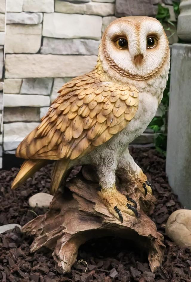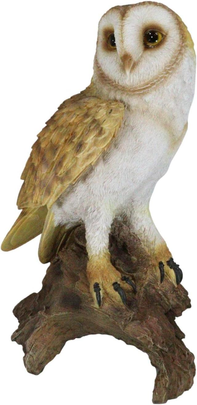 Ebros Gift Realistic Nature Wildlife Common Barn Owl Perching On Tree StumpStatue 13.75" Tall Lifelike Nocturnal Owl Taxidermy with