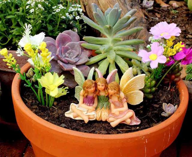 : 妖精の庭は小さいので、大きな屋外スペースがない人々に緑を与えます。この愛らしい庭の妖精は、フェアリー・ガーデン・コンテナに楽しいフォーカスを作成することができます。