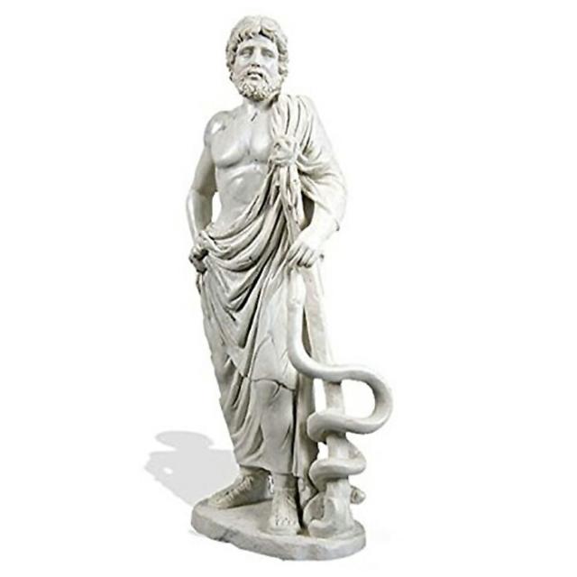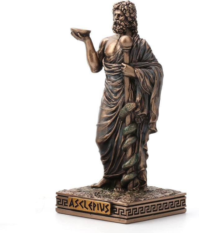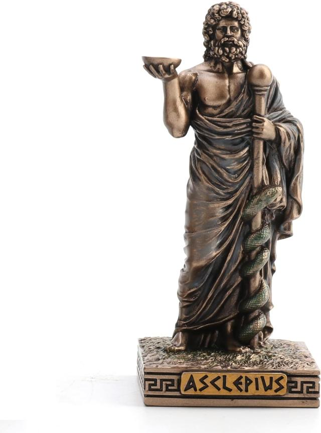 アスクレピオスはギリシャの医学、治癒、医師の神であり、若返りと幸福に関連しています。アスクレピオスの杖と呼ばれる蛇が絡まった杖を持った姿で描かれることが多い彼は、アポロンと死すべき王女コロニスの息子です。アスクレピオスの崇拝と神殿はアスクレピオンとして知られ、 古代ギリシャでは治癒病院として機能しました