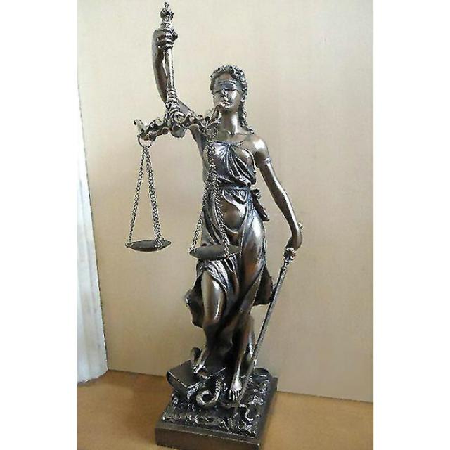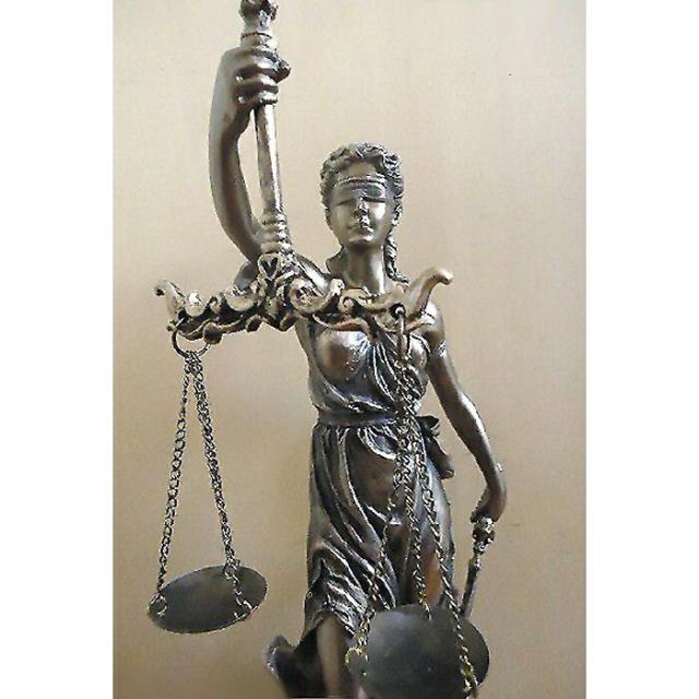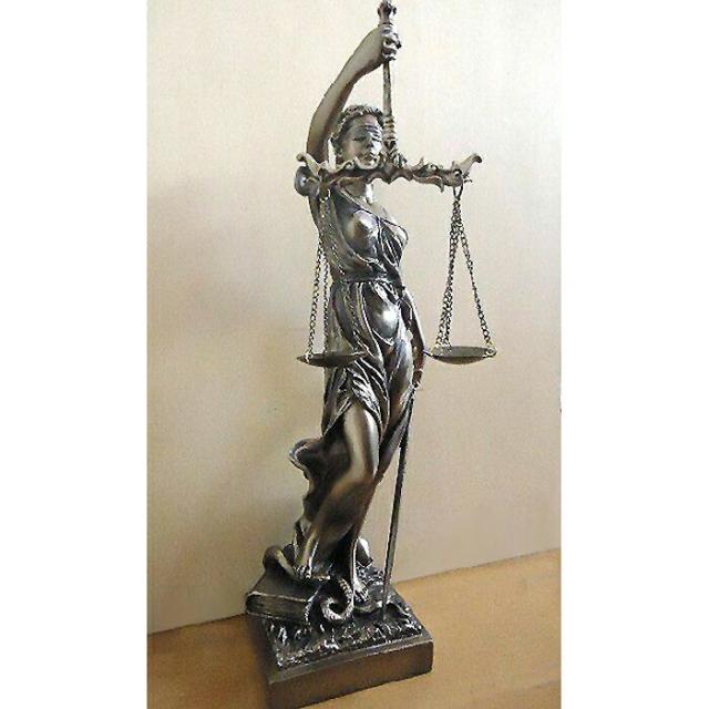 正義の女神テミスは、神話に登場する女神である。目隠しをした女性が剣と天秤を持つ姿として描かれる。司法・裁判の公正さを表す象徴・シンボルとして、古来より裁判所や法律事務所など、司法関係機関に飾る彫刻や塑像として扱われてきた。