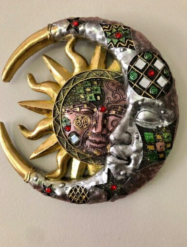 赤いモザイクの三日月と太陽 彫刻