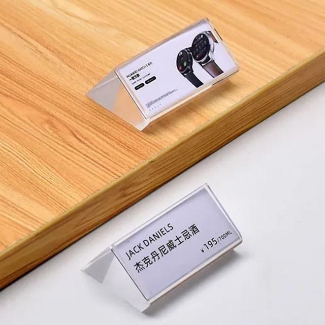 視認性のいいクリアのプラスチック製のディスプレイスタンドは、宝石店やジュエリーショップ、時計店や洋服店、家具屋や食品関係、雑貨屋、カメラ屋、化粧品店などなどいろいろなプライスタグやネームプレートに使えます。