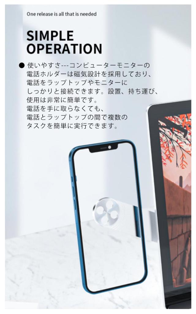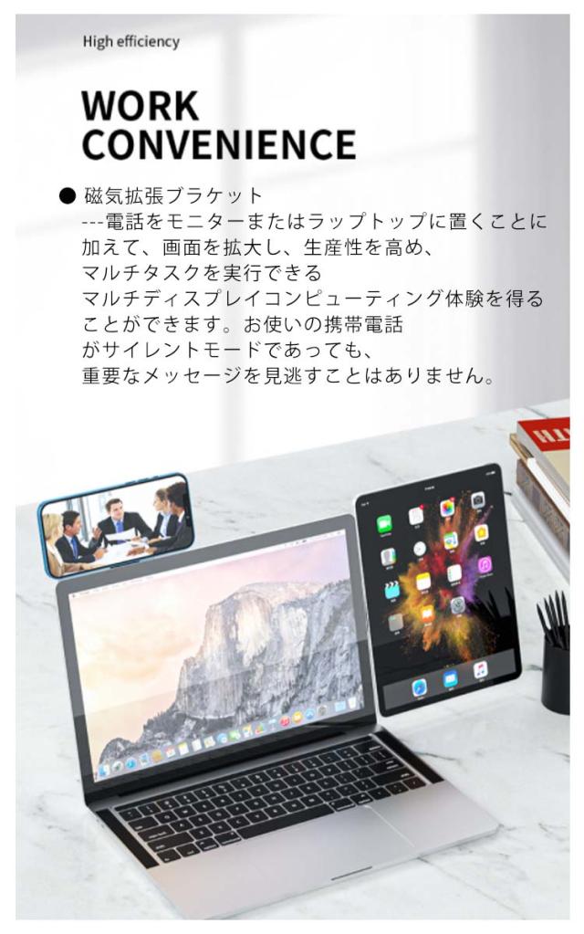 | 使いやすさ---コンピューターモニターの電話ホルダーは磁気設計を採用しており、電話をラップトップやモニターにしっかりと接続できます。設置、持ち運び、使用は非常に簡単です。電話を手に取らなくても、電話とラップトップの間で複数のタスクを簡単に実行できます。 磁気拡張ブラケット---電話をモニターまたはラップトップに置くことに加えて、画面を拡大し、生産性を高め、マルチタスクを実行できるマルチディスプレイコンピューティング体験を得ることができます。お使いの携帯電話がサイレントモードであっても、重要なメッセージを見逃すことはありません。 | |