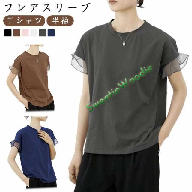 ティアードスリーブ ティーシャツ フリル袖 モテ レディース トップス 半袖 フリル袖 Tシャツ フリル袖 トップス 細見え シンプル 春 夏 カットソー 楽ちん すっきり 着やせ かわいい 可愛い ブラック ブラウン ピンク ホワイト ダークグレー