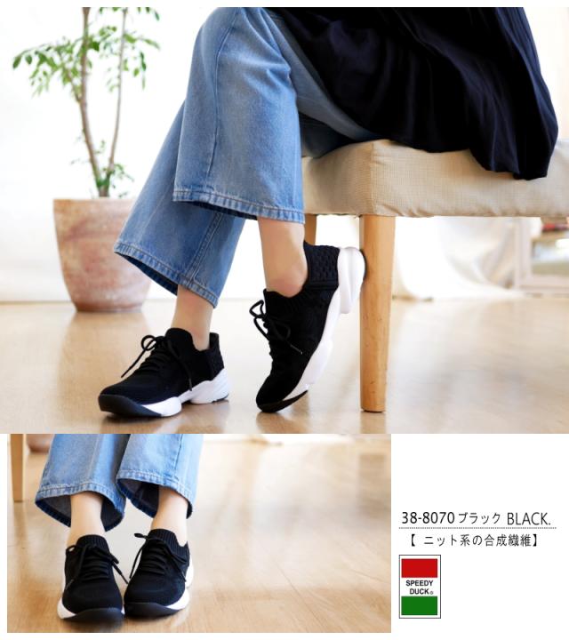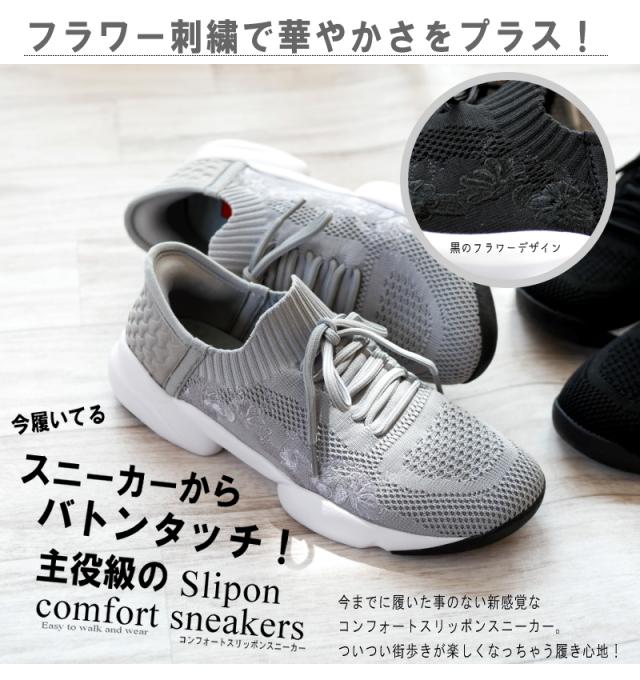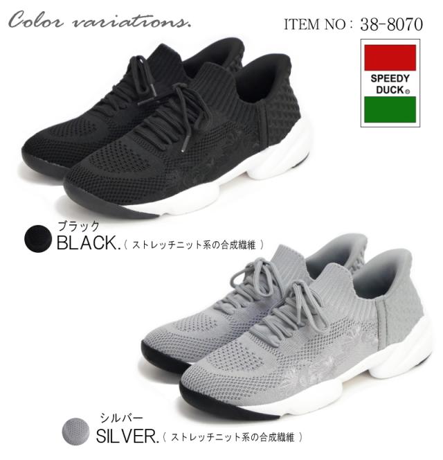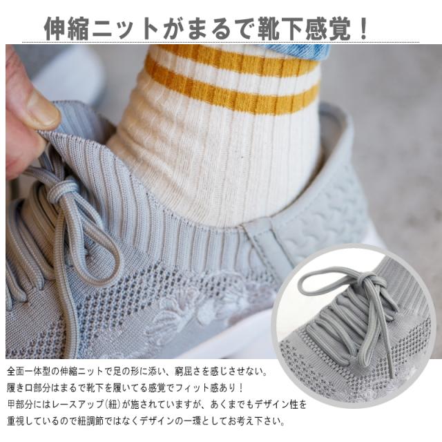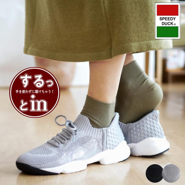 SPEEDY DUCK スニーカー 靴 レディース スリッポン レースアップ ストレッチ ニット 花柄 刺繍 するっとイン 手を使わずに履ける ハンズフリー 軽量 屈曲 黒 シルバー 履きやすい 3e