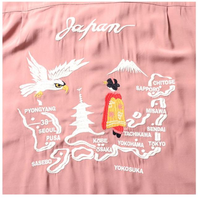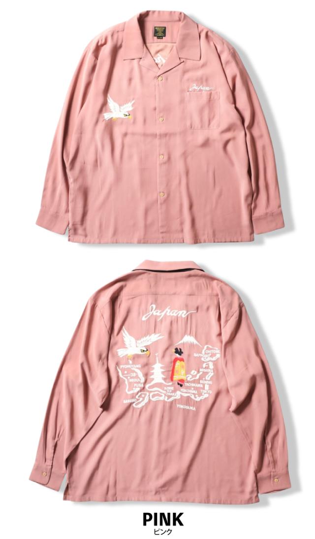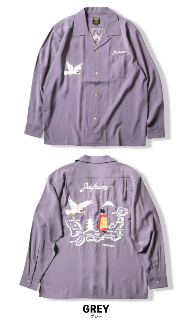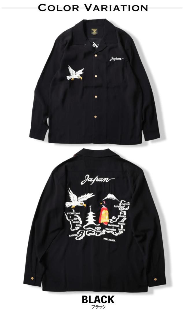 スカジャンでも人気の日本地図柄をシャツへと採用。長袖タイプなので春先の羽織としても活躍できる。