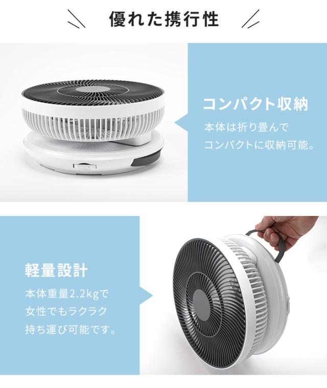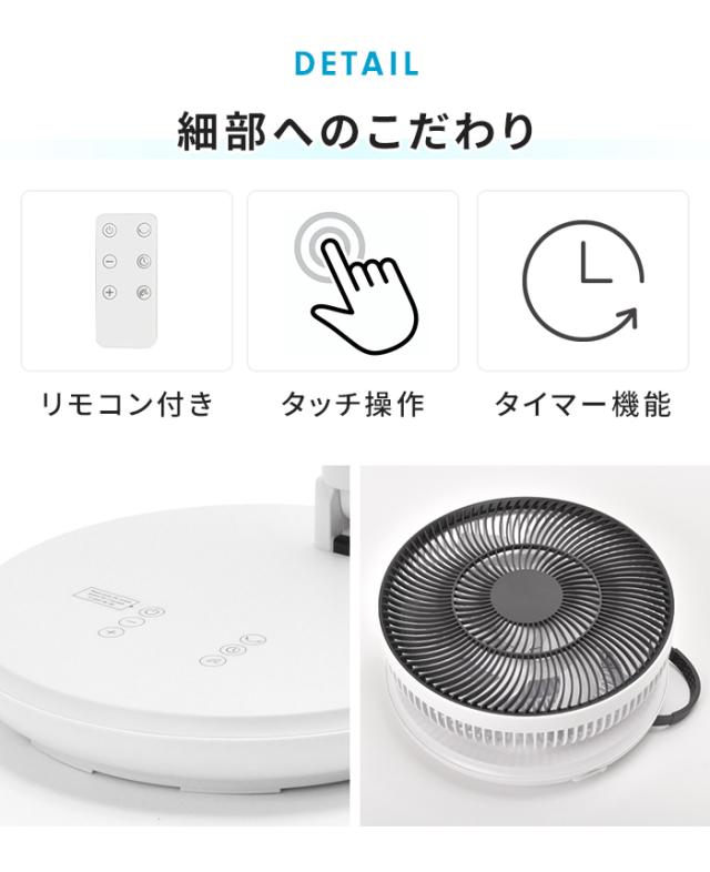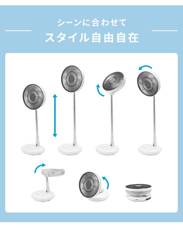 | 外羽根8枚、内羽根8枚の計16枚の羽根から送り出されるなめらかで優しい風を生み出す扇風機。 静かで強力なDCモーターを搭載しており、8段階の風量調整が可能です。 軽量&折り畳み式でなので、使用しない時はコンパクトに収納でき、持ち運びも簡単。 コードレスで充電式なので、リビングはもちろん、キッチンや寝室、さらにはアウトドアやオフィスなど、場所を選ばずに快適な涼しさを提供します。 7800mAhの大容量バッテリーを内蔵しているため、外出先でも安心して使用できます。 [充実の機能] ◇ 折りたたみ可能 折畳時のサイズは直径28cm、高さ13.7cmのコンパクトサイズでオフシーズンの収納場所にも困りません。 ◇ 無段階高さ調節 送風口の高さを54〜94cmまで無段階で調節できます。 ◇ 上下角度調整 送風口の上下角度を約180°調整可能。 ◇ 首振り角度調節 30度・60度・90度の自動首振り角度調整が可能。 ◇ 風量調整(8段階+1自動風モード) 1〜8段階の風量調整が可能。 自然の風のような不規則な風の強弱を再現した自然風モード付。 ◇ 切タイマー設定 1〜8時間の間で1時間単位で切タイマー予約ができます。 ◇ タッチ操作 タッチ操作で簡単に操作できます。 ◇ 移動に便利なラバーハンドル付き 折畳時はラバーハンドル付で持ち運びもラクラク。 ◇ 様々なシーンで活躍 スポーツ観戦、花火大会、花見、釣り、ドライブなどに大活躍。 |