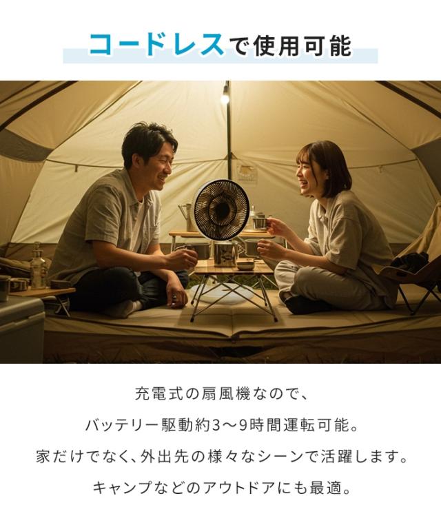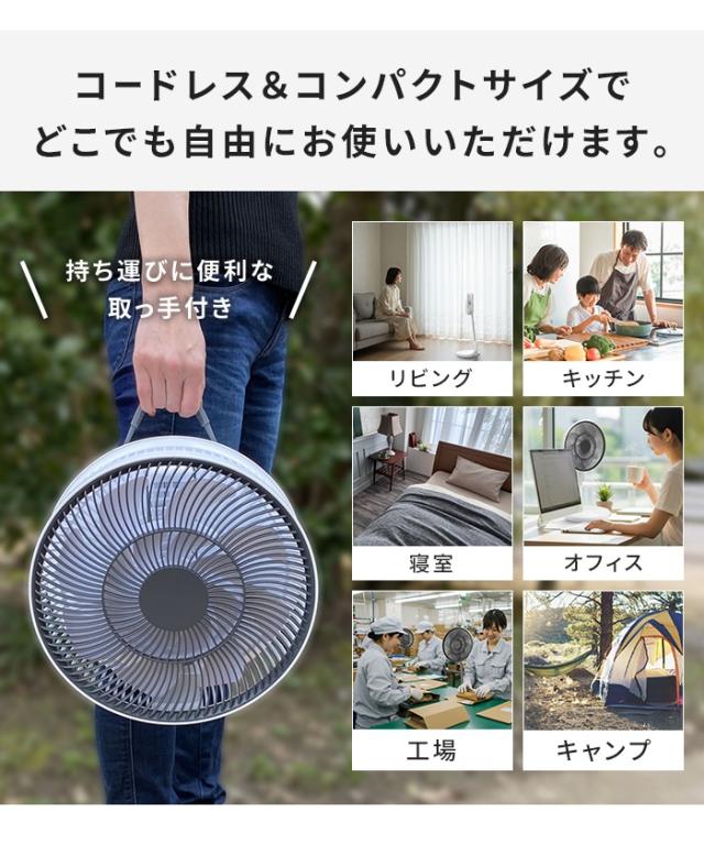 コードレスで充電式なので、リビングはもちろん、キッチンや寝室、さらにはアウトドアやオフィスなど、場所を選ばずに快適な涼しさを提供します。