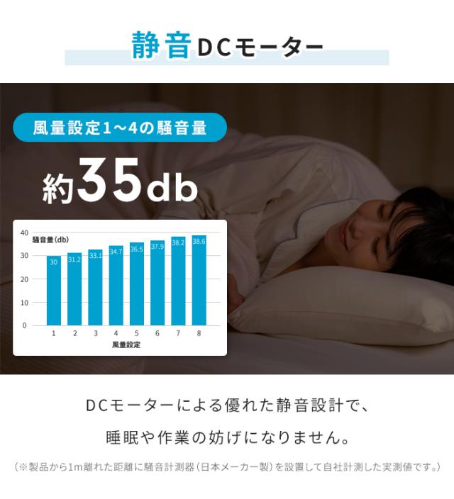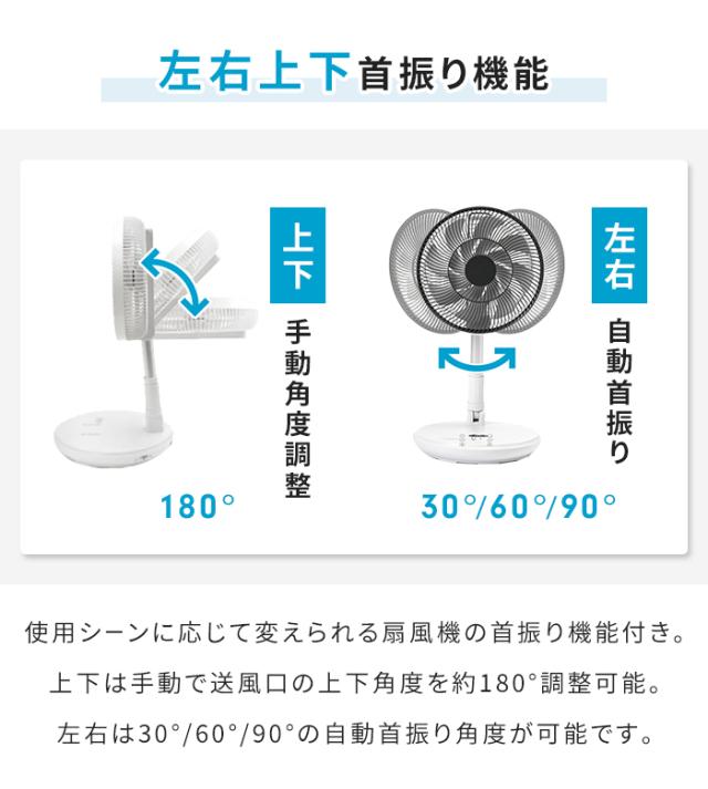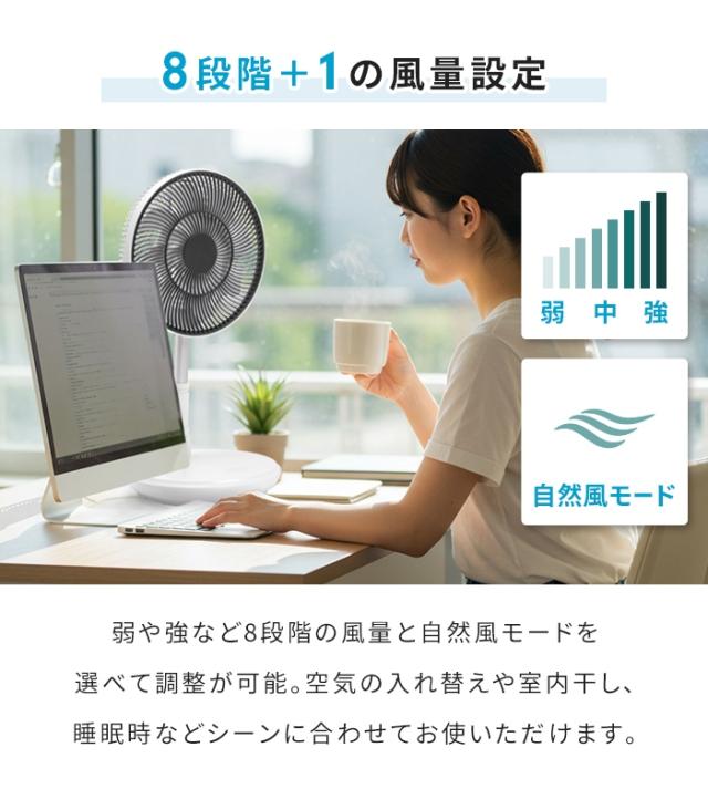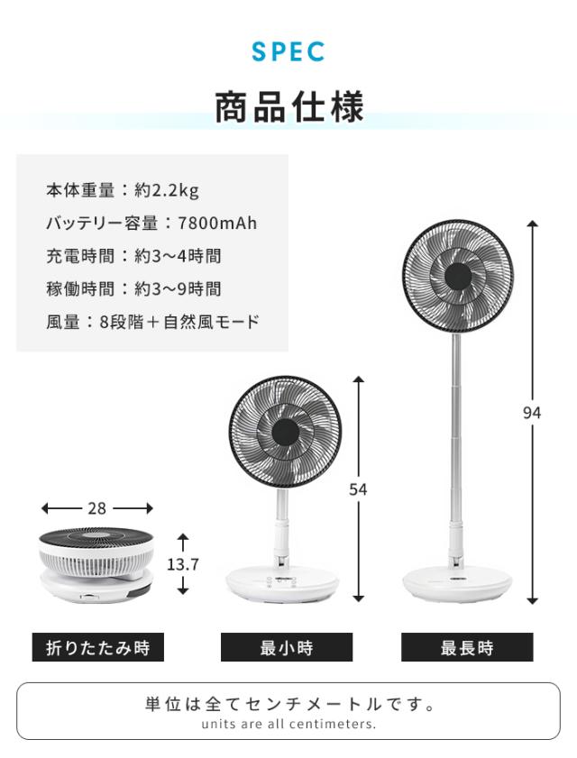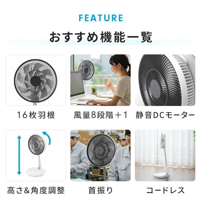 | ・16枚羽根 ・風量調節:8段階 ・自然風モード ・首振り機能:3段階切替(30度・60度・90度) ・切タイマー(1〜8時間) ・リモコン付き ・タッチ操作 ・バッテリー駆動:3〜9時間 ・持ち運び用ハンドル付 |