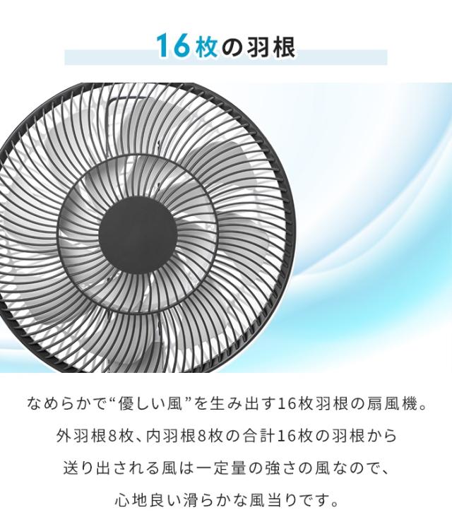 外羽根8枚、内羽根8枚の計16枚の羽根から送り出されるなめらかで優しい風を生み出す扇風機。