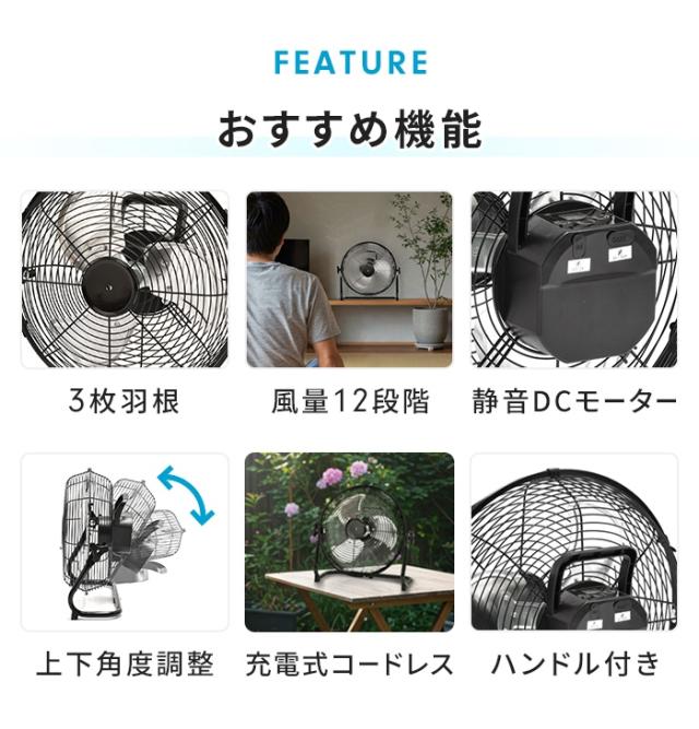 | ・アルミブレードを採用した耐食性に優れた3枚羽根 ・静音DCモーター ・風量調整12段階 ・上下角度調整 ・バッテリー駆動:4〜30時間 ・持ち運び用ハンドル付き |