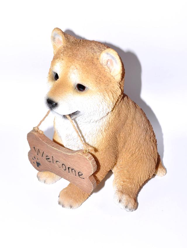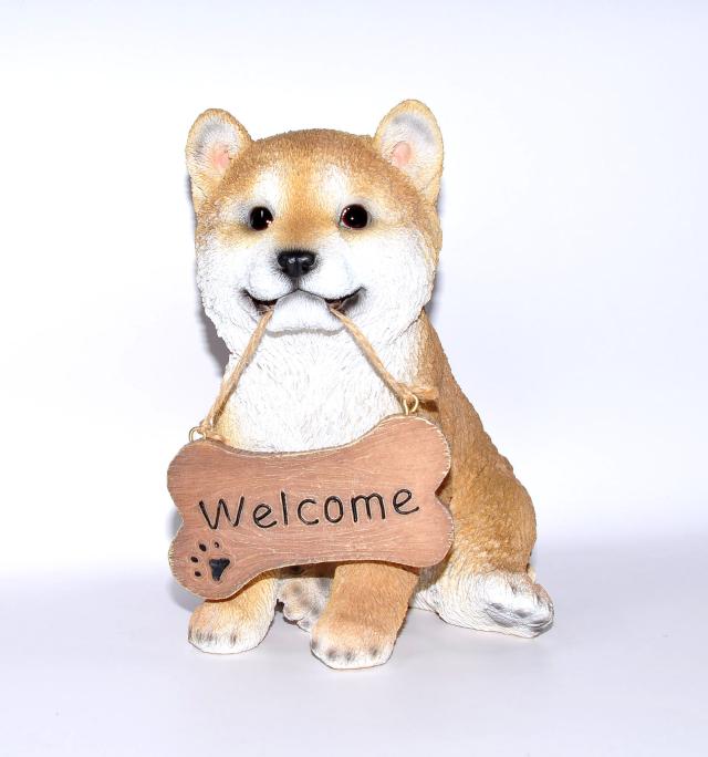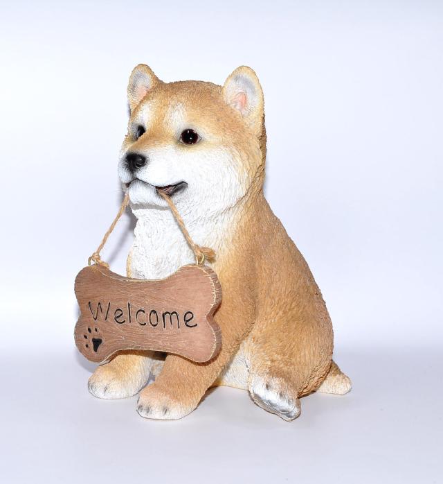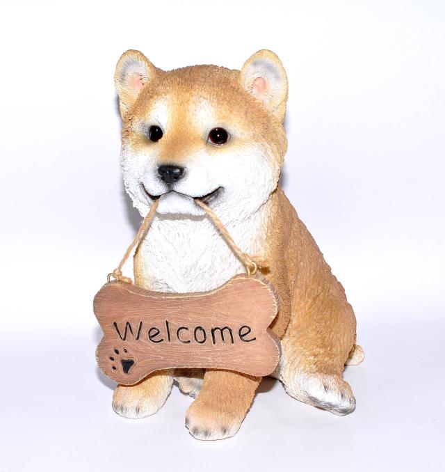 welcomeサインを咥えた 柴犬彫像[ウェルカムオブジェ]ドッグオーナメント