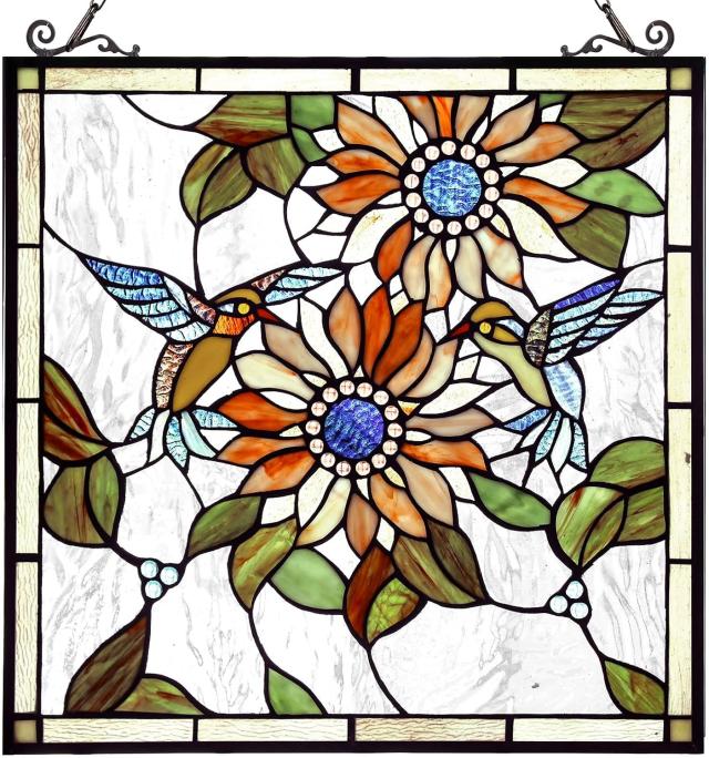 スイス チーズ プラントとしても知られる、モンステラ デリシオーサは、メキシコ南部からパナマ南部の熱帯林に生息する花の咲く植物です。多くの熱帯地域に導入され、ハワイ、セイシェル、アセンション島、ソシエテ諸島では、軽度の侵略的種となっています。これは、スイスチーズプラントの枝に、2羽のオオハシが止まっている、ティファニースタイルのステンドグラスのウインドウパネルです。オオハシはかわいくて美しく、特に緑と赤の大きなくちばしがあり、日光に当たると反射が見えます。窓や壁の装飾に、ぴったりで、間違いなく多くの褒め言葉をもらえるでしょう。
