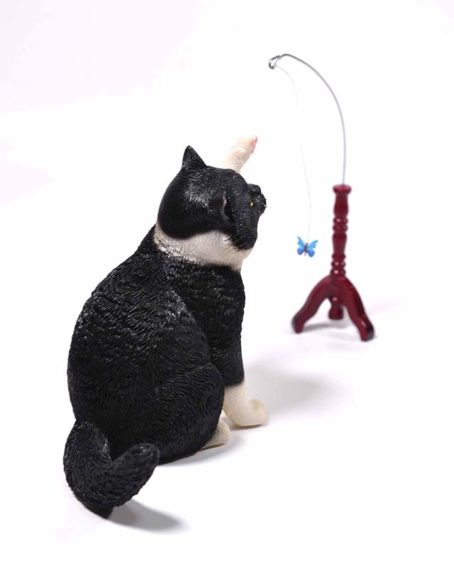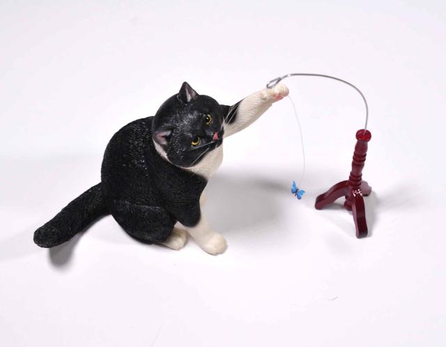1/6サイズ蝶のネコじゃらしと遊ぶ黒白猫ブリティッシュ ショートヘアーリアルフィギュアネコ動物彫像置物猫好き輸入品JXK-127C