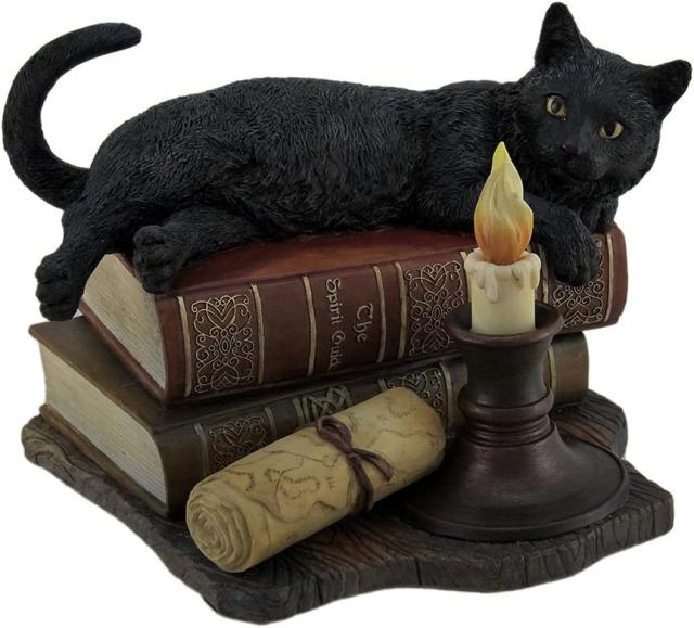 アーティストのリサ・パーカーがデザインした「The Witching Hour」は、燃えるろうそくの輝きに照らされた、魔法の本の山の上に座る、明るい黄色の目をした神秘的な黒猫を再現しています。この幻想的な彫像は、レジン製で巧みに製造され、非常にリアルに見え驚くほどの質感のディテールがります。