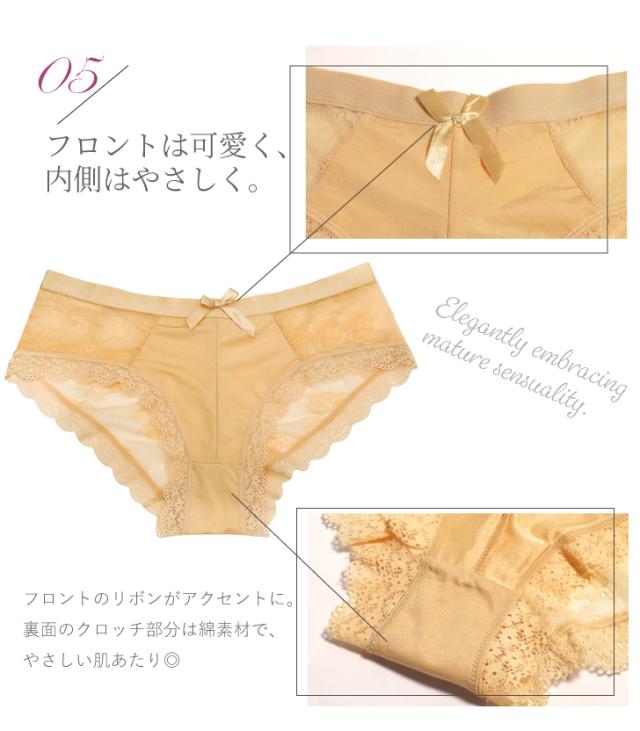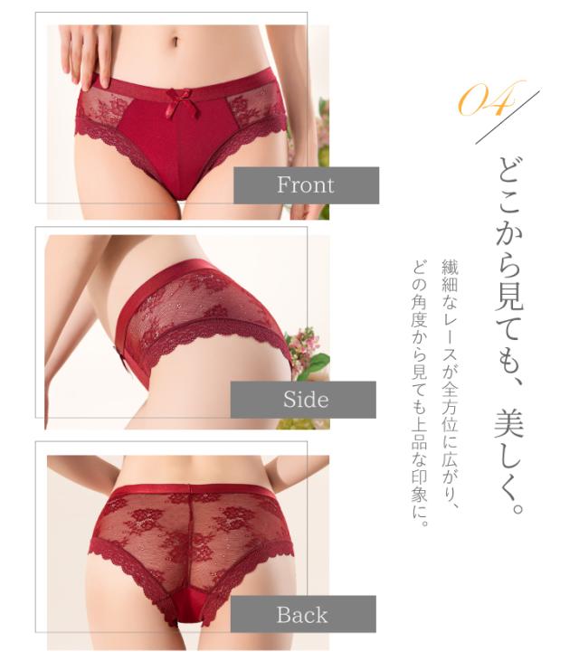 サイドからバックにかけて広がる可憐な小花柄レースが、華やかな雰囲気を演出。フロントにあしらわれたリボンがさりげないアクセントに。普段使いもしやすい上品な一枚です。