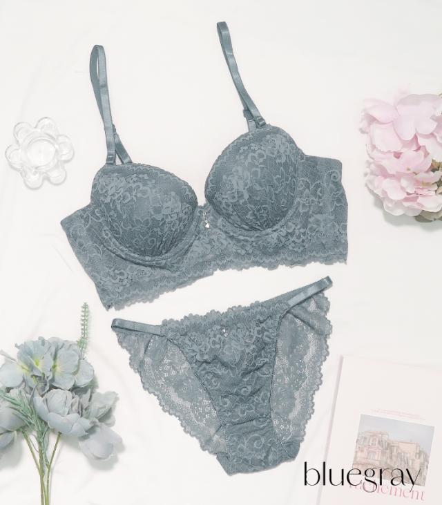 お花のレースが上品なブラ&ショーツセット。繊細な総レースデザインが甘すぎず、大人のエレガントさを演出。落ち着きのあるカラーが自然に肌に溶け込み、上品な印象に。脇高仕様でバストをしっかり包み込み、美しいボディラインをメイクします。ショーツのバックも総レース仕立てで、フィット感が良くタイトなボトムにも響きにくいのが魅力♪肌なじみの良いピンクとブルーグレーの2色展開です。