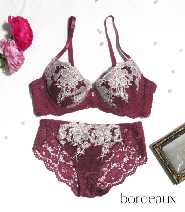 華やかなフラワー刺繍がアクセント。キレイもカワイイもどっちも欲しい!そんな時におすすめな大人可愛い欲張りデザインブラ。ナチュラルに盛れる快適なつけ心地。ショーツのバックデザインは総レース仕様