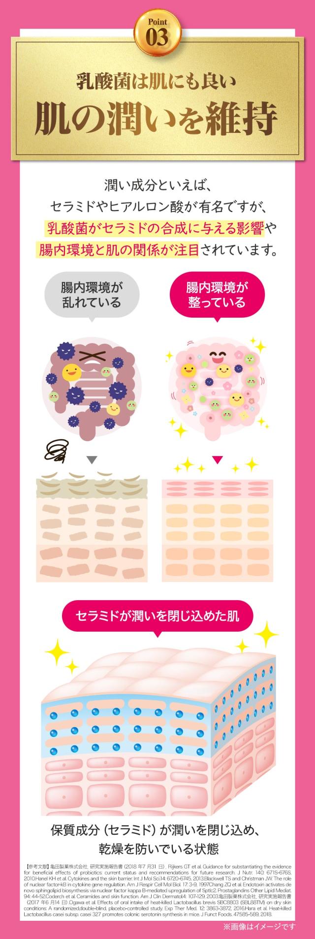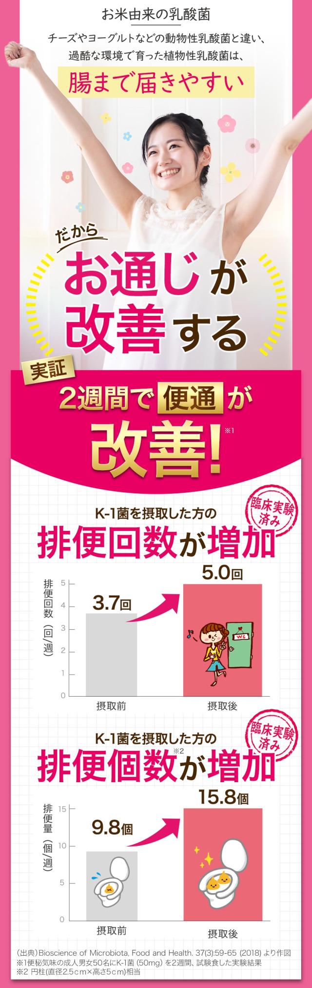 本品には植物性乳酸菌K-1(L.casei327)が含まれます。植物性乳酸菌K-1(L.casei327)には、肌の潤いを維持する機能、お通じを改善する機能があることが報告されています。