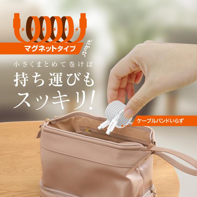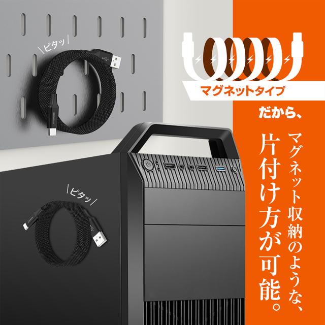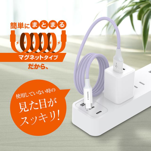 | マグネットの磁力でケーブル同士がくっつくため、巻くように重ねるだけでキレイにまとまり、保管も使用も持ち運びもケーブルがゴチャついて絡まらずにスッキリ使える、USB Type-C ケーブルです。