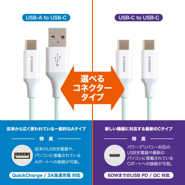 | USB TYPE-A TO USB TYPE-CケーブルとUSB TYPE-C TO USB TYPE-Cケーブルの2種類からお選び頂けます。