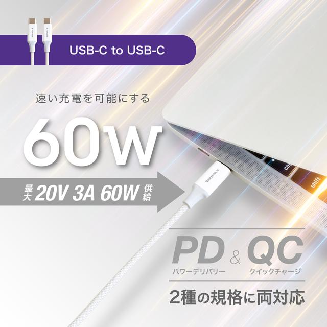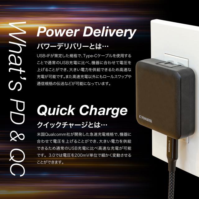| PD(Power Delivery)とQC(Quick Charge)に両対応し、対応したUSB-Cポート搭載充電器と合わせて使用することで、最大出力60W(20V/3A)の急速充電機能でノートPCを充電、またスマートフォンを約30分で最大50%までの充電が可能な、USB-C to USB-Cケーブルです。