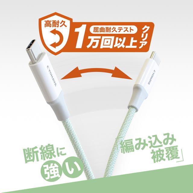 | 断線に強い編み込み被覆を採用することで、屈曲耐久テストを1万回以上クリアする、高耐久性を実現した、USB TYPE-C ケーブルです。(当社調べ) |