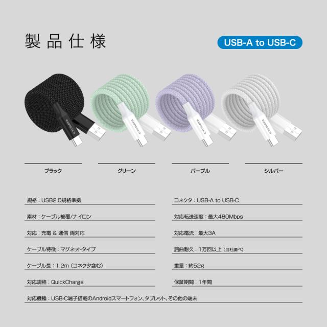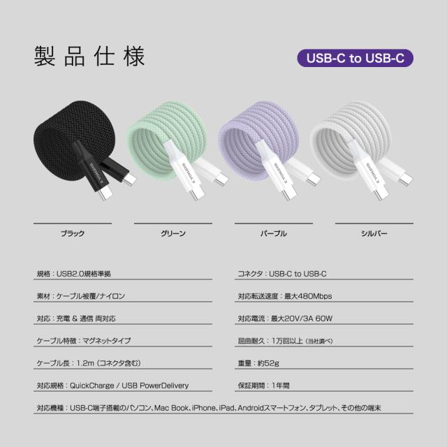 | 商品名 | USB Type-C マグネット ケーブル 絡まない 簡単にまとまる 急速充電 PD QC 対応 A to C / C to C 選べるコネクター タイプC 充電ケーブル 1.2m KYOHAYA JKMGC |