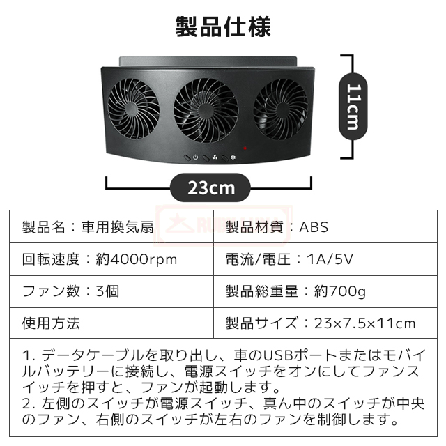 | 使用方法 | ◆1. データケーブルを取り出し、車のUSBポートまたはモバイルバッテリーに接続し、電源スイッチをオンにしてファンスイッチを押すと、ファンが起動します。 ◆2. 左側のスイッチが電源スイッチ、真ん中のスイッチが中央のファン、右側のスイッチが左右のファンを制御します。 |