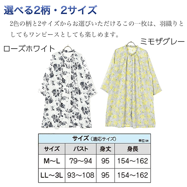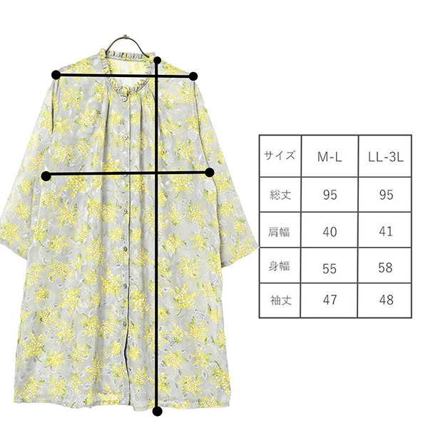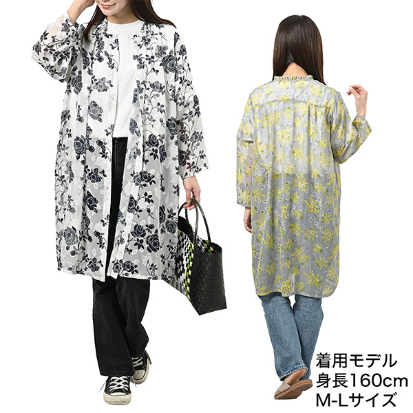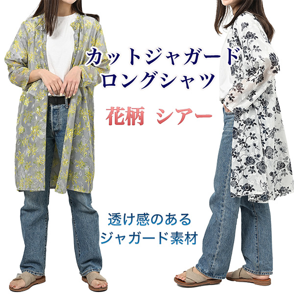 カットジャガード ロングシャツ ‐花柄 シアー ロングカーデガン ロング丈 花柄 大きなサイズ レディース ブラウス 8分袖 春 夏 ホワイト グレー バラ ローズ ミモザ