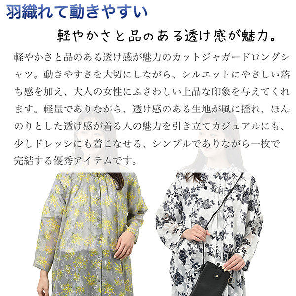 軽やかさと品のある透け感が魅力のカットジャガードロングシャツ。動きやすさを大切にしながら、シルエットにやさしい落ち感を加え、大人の女性にふさわしい上品な印象を与えてくれます。軽量でありながら、透け感のある生地が風に揺れ、ほんのりとした透け感が着る人の魅力を引き立てカジュアルにも、少しドレッシーにも着こなせる、シンプルでありながら一枚で完結する優秀アイテムです。