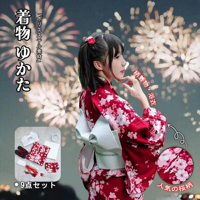 赤 小桜柄 浴衣 セット レディース 涼しい ポリエステル素材 シワになりにくい 色落ち防止 着付け簡単 花火大会 忘年会 新年会 発表会 浴衣 着物 和装 ?女性 yukata ゆかた ユカタ 帯 兵児帯 下駄 簡単 簡易 大人 20代 30代 40代 50代