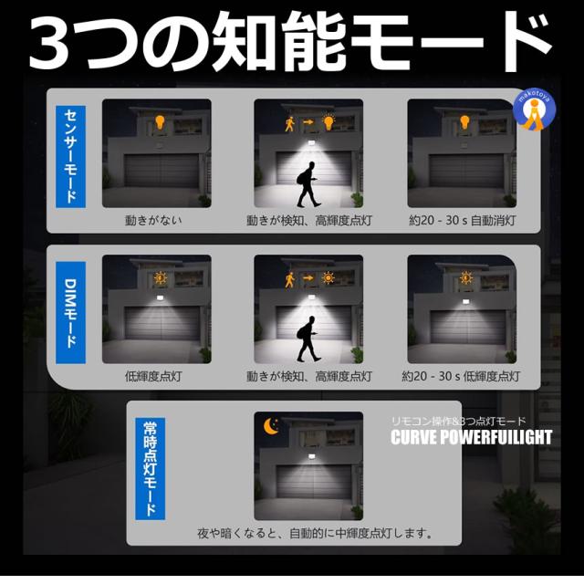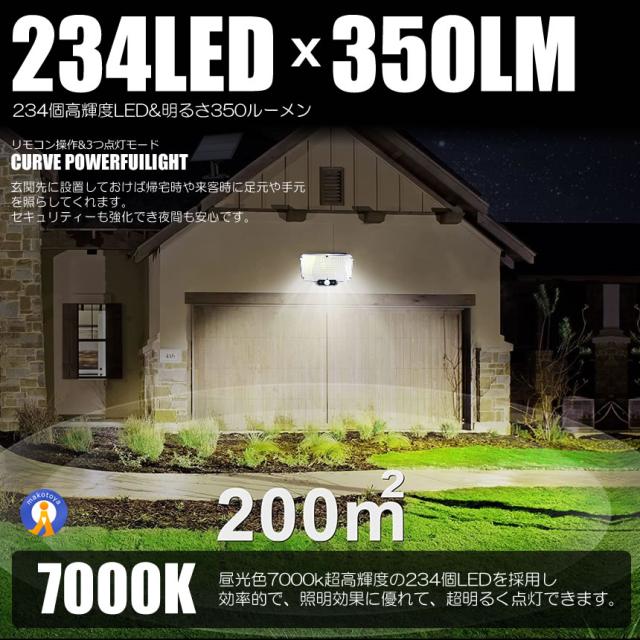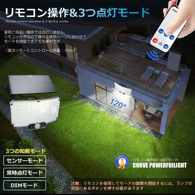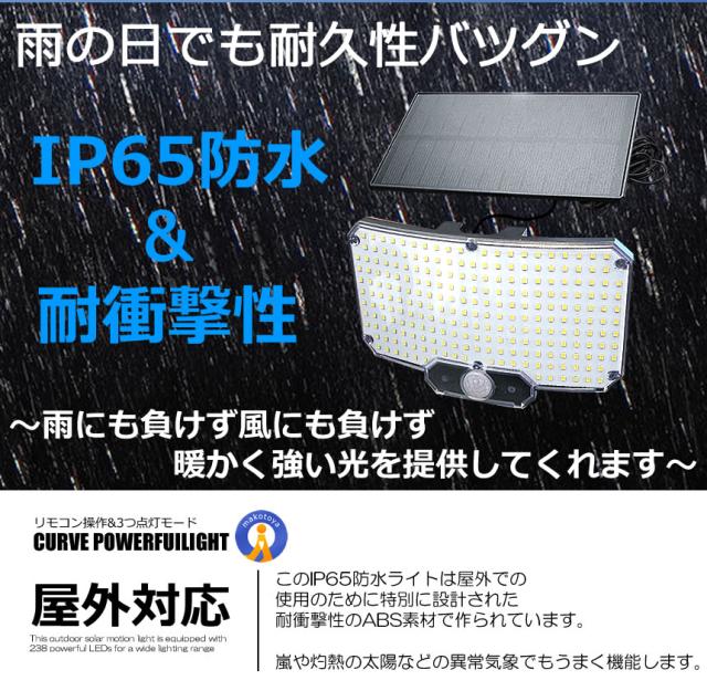 このソーラーライトは昼光色7700k超高輝度の228個LEDを採用し