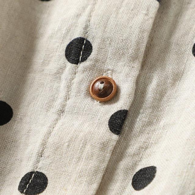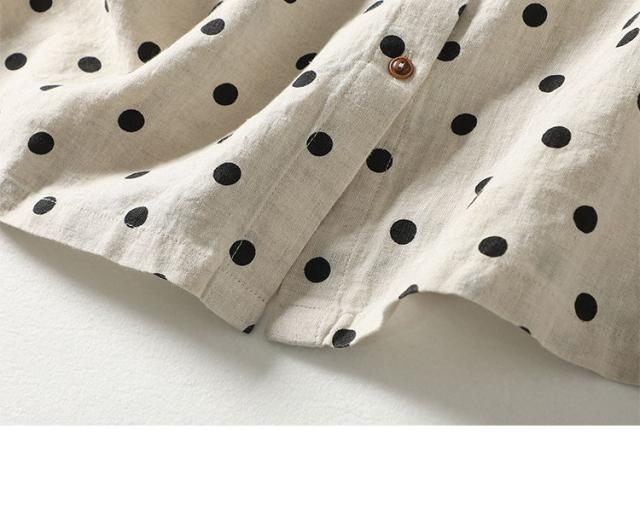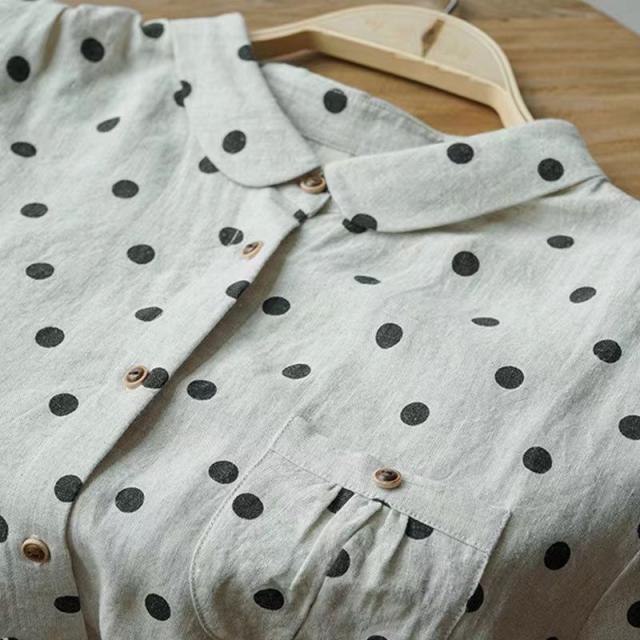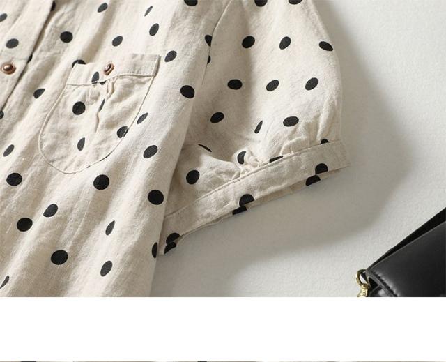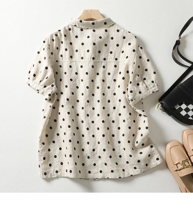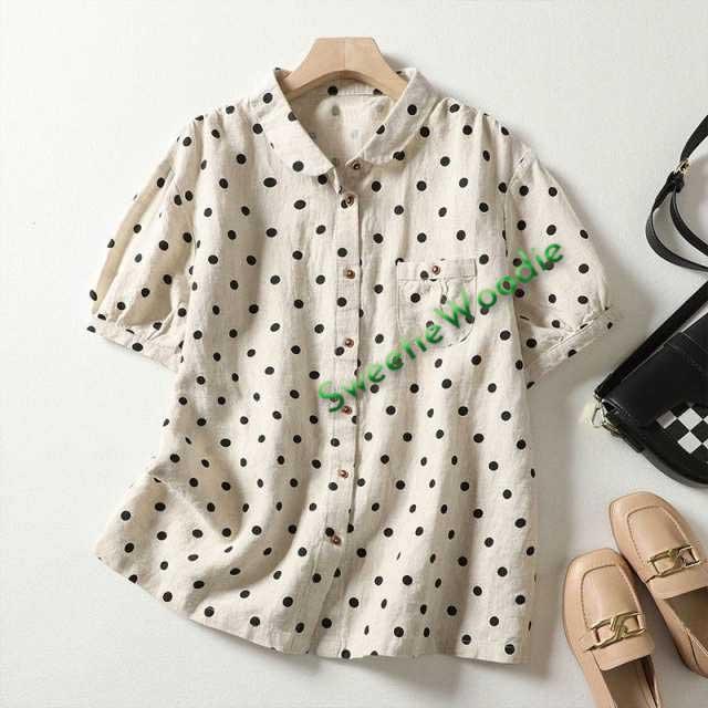 送料無料 半袖シャツ レディース ドット 春 夏 シャツ ブラウス 折り襟 半袖 ドット柄 総柄 トップス 綿麻風 ドットシャツ 体型カバー ゆったり 前開き シンプル おしゃれ