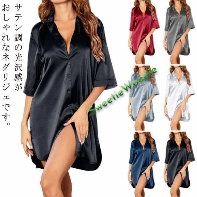 サテン ルームウェア ワンピース シャツ ネグリジェ 前開き レディース 半袖 パジャマ ワンピース Aライン サテン調 パジャマ 寝間着 部屋着 ナイトウェア 寝巻き 薄手 ゆったり 春 夏 秋 母の日 ギフト プレゼント 送料無料