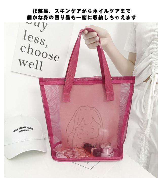 | メッシュで通気性がバツグンなメッシュトートバッグです メッシュ素材なので、濡れた洋服やタオルなどを入れても安心です。 化粧品、スキンケアからネイルケアまで細かな身の回り品も一緒に収納しちゃえます とても軽いので畳んで収納すれば旅行や出張などにも手軽に持って行けますよ 温泉、ご旅行、ジム、入院時のベットサイドなどなどあらゆるシーンで大活躍 | |