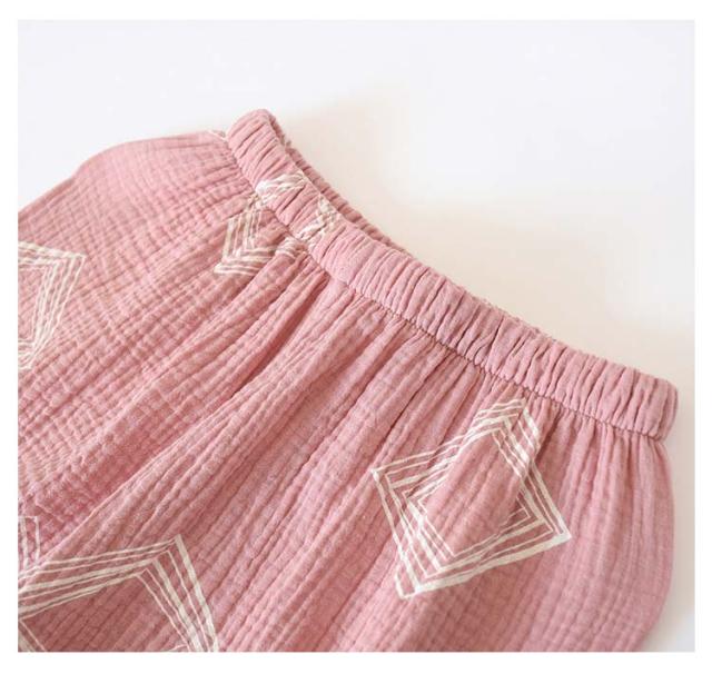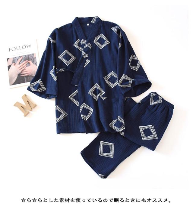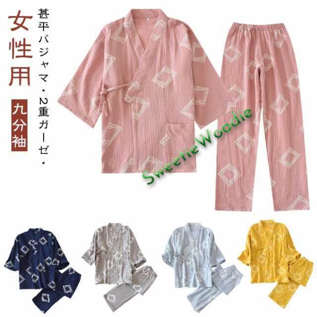 | 甚平パジャマ・2重ガーゼ・女性用 浴衣のような前開きパジャマ上下セパレートが脱着簡単。 さらさらとした素材を使っているので眠るときにもオススメ。 生地表面に凸凹加工が施されており吸湿性&速乾性が高く、夏場に最適な素材。 通気性と吸水、吸湿性に優れたガーゼ素材 とっても涼しいうえにエアコンなどの 冷えからもしっかりガードしてくれます。 肌ざわりが優しく風通しが良いので、部屋着や寝間着などリラックスウェアとして重宝します。プレゼントとしてもおすすめ。 | |