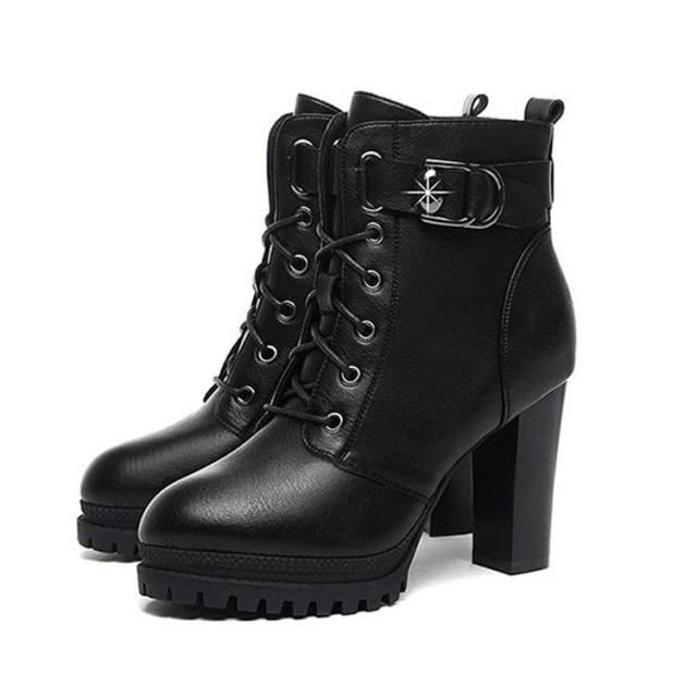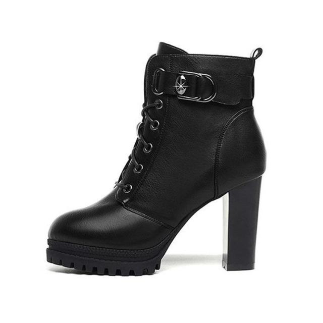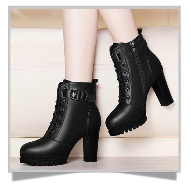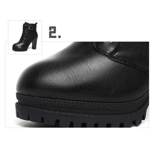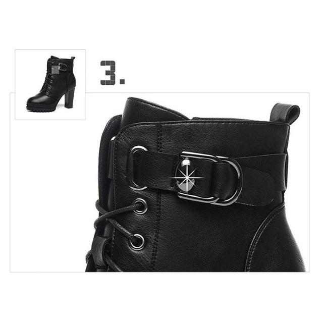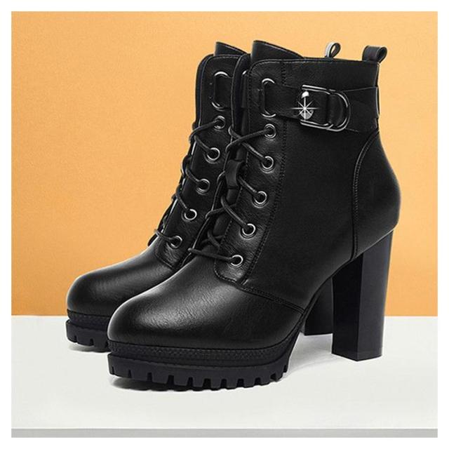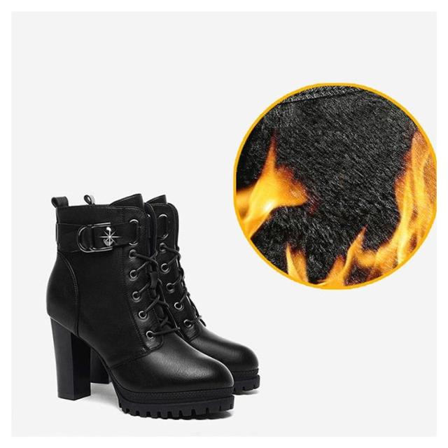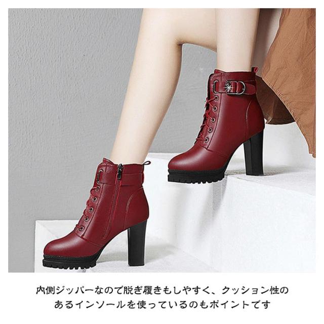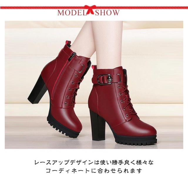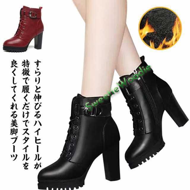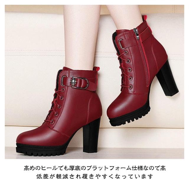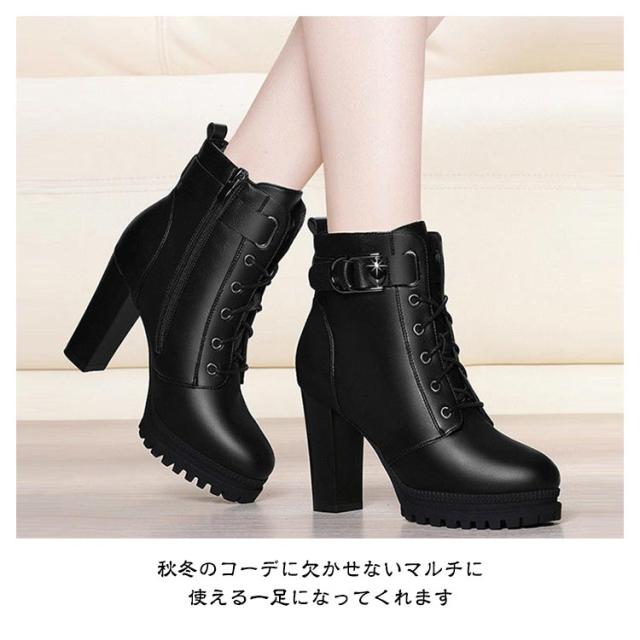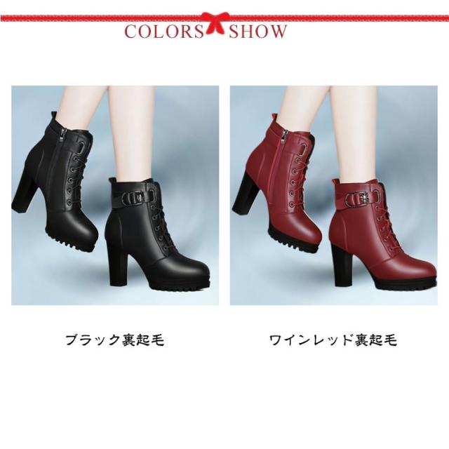 編み上げ ショートブーツ レディース 冬 裏起毛 9cm ハイヒール レースアップ ブーツ サイドジップ チャンキーヒール 厚底 防寒 保温 シューズ 靴 あたっか 歩きやすい 疲れない 黒 ブラック おしゃれ