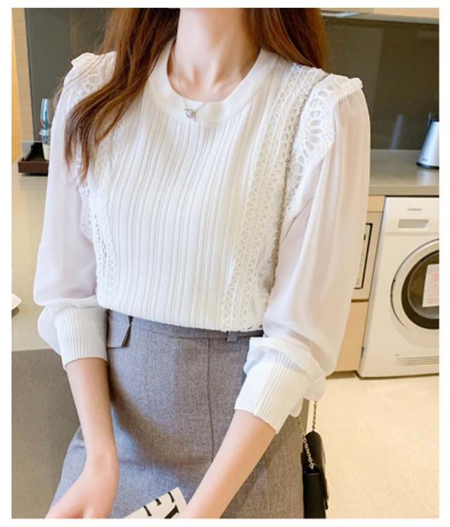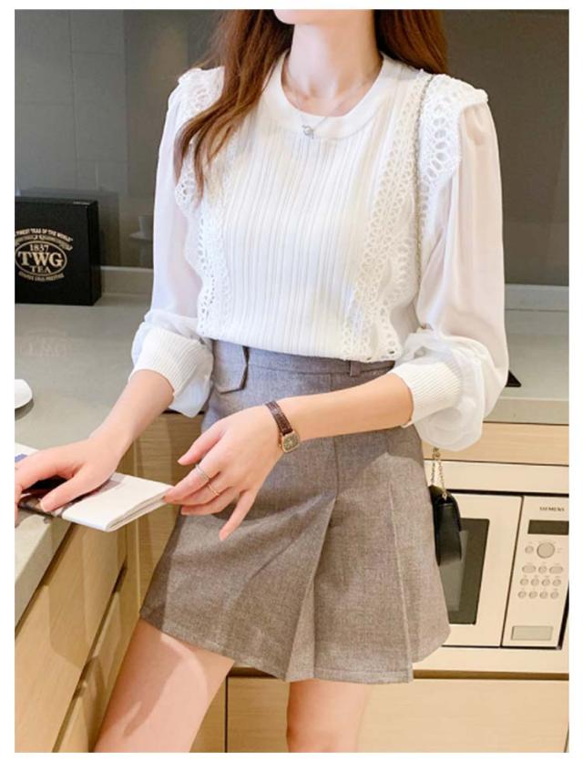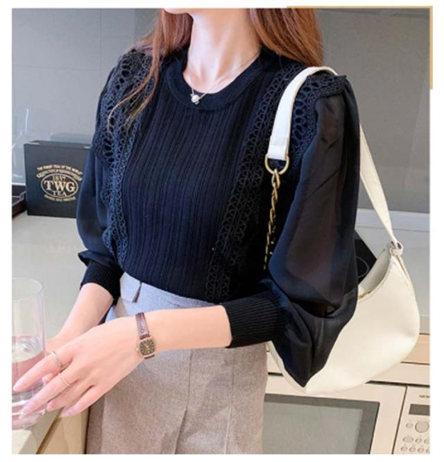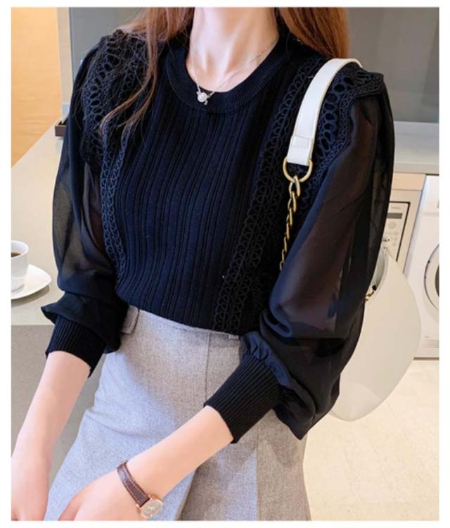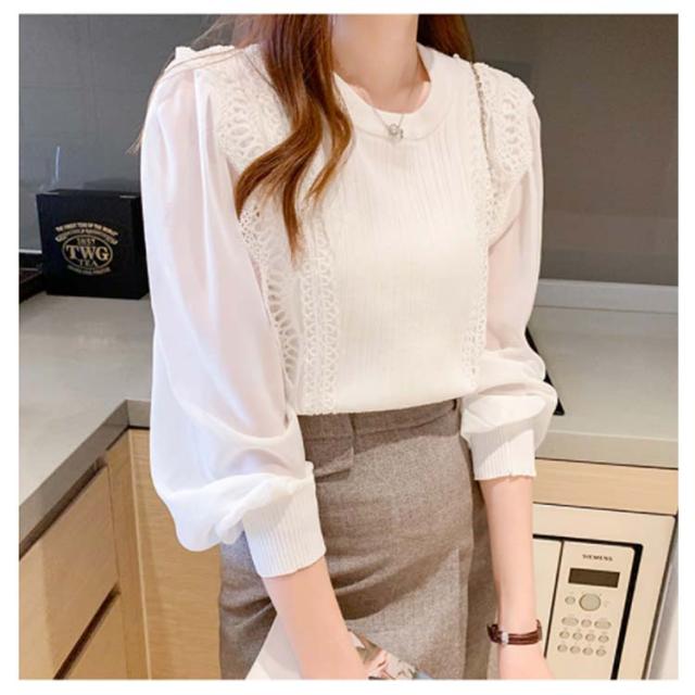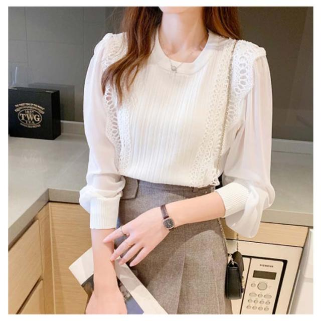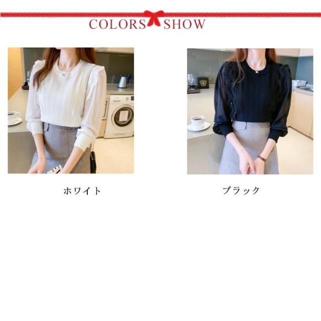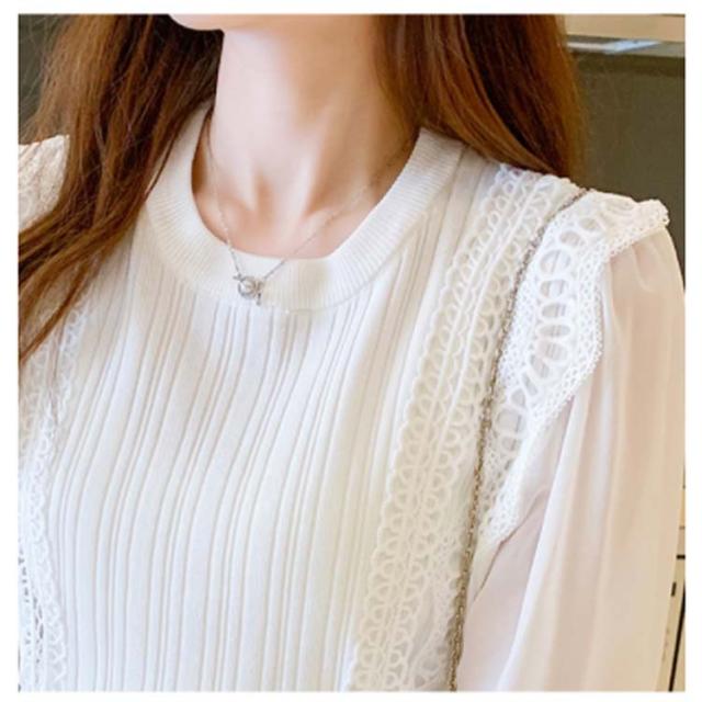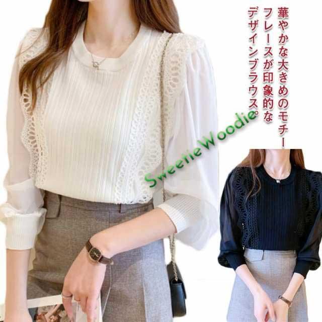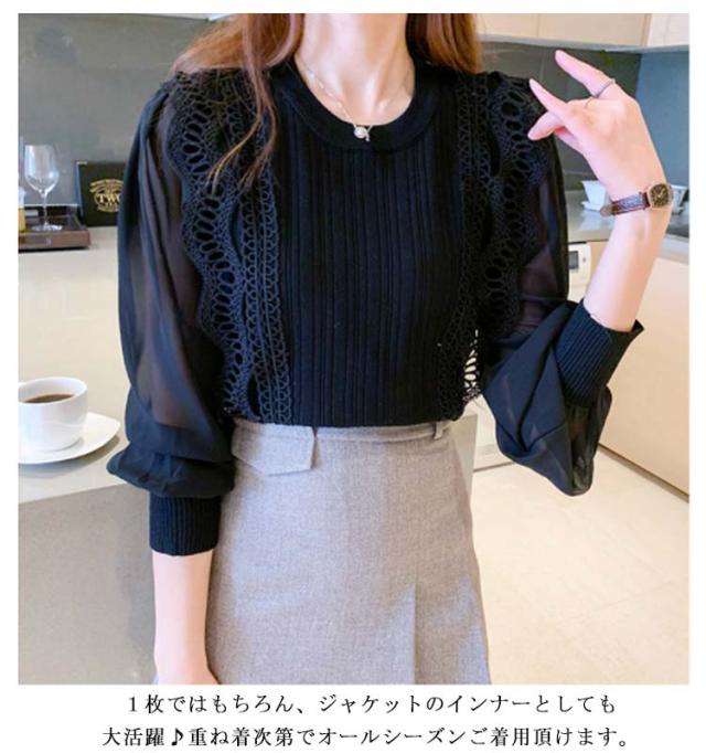 送料無料 レースブラウス レディース ニット カットソー プルオーバー トップス シャツ 長袖 フリル レース スカラップ シアースリーブ ボリューム袖 シフォン パステル 無地 立ち襟 きれいめ フォーマル お呼ばれ 通勤