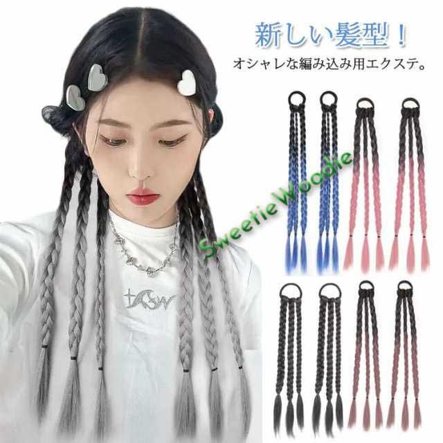 2点セット ポニーテール 三つ編み エクステ つけ毛 自然 ドレッド ウィッグ へアゴム 編み込み カラー グラデーション エクステンション つけ毛 大人 子供 キッズ ガールズ 毛束 パープル グレー ブラック ブルー 派手 コーンロウ ダンス 送料無料