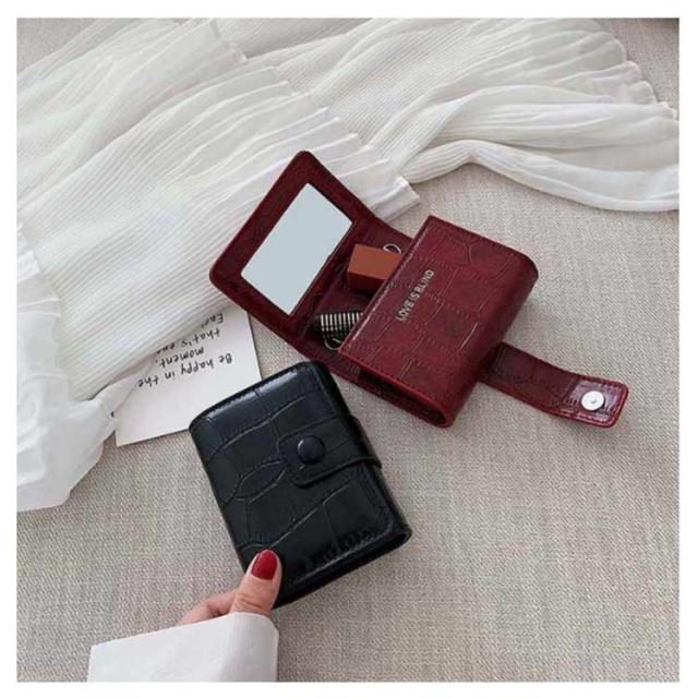 | 小さなミラー付きなので簡単なメイクのお直しなどにとても便利なポーチです。 シンプルなデザインで、コンパクトサイズなので携帯に便利! 鞄の中で探す手間が無くなる!リップクリームや口紅など、サッと出せて、すぐに使える! お札や小銭はもちろん、カード、鍵、リップクリームなども入ります。 磁石の閉鎖により、持ち運びが容易な場所にコンテンツが確保されます。 旅行時のアクセサリーポーチとしてもお勧めです。 | |