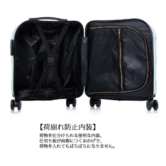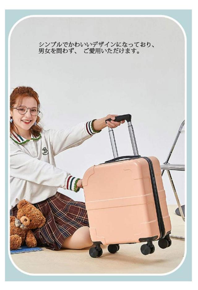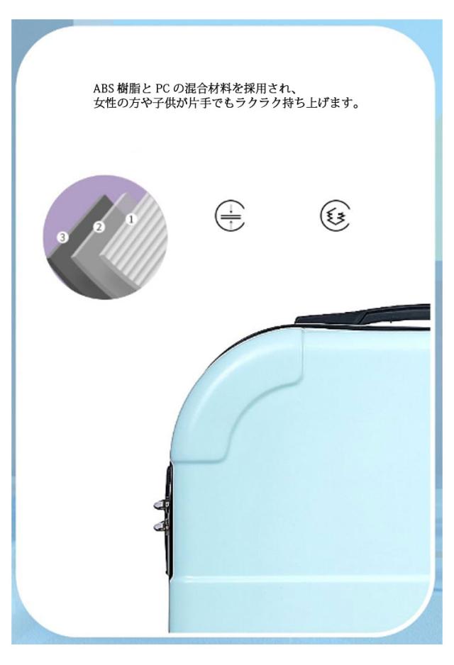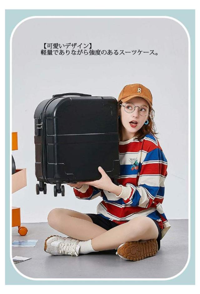 | 【静音順滑360度】ユニバーサルホイール360°はバリアフリーで回転し、道の揺れは依然として穏やかで、旅をより楽に快適にすることができます。硬角保護は箱体保護を強化し、衝突を防止し、使用寿命を延長します。 【機内持ち込みサイズ】搭乗可能なスーツケース。 ABS樹脂とPCの混合材料を採用され、女性の方や子供が片手でもラクラク持ち上げます。超軽量ですから海外のトラベルやビジネス出張に便利です。 【可愛いデザイン】軽量でありながら強度のあるスーツケース。シンプルでかわいいデザインになっており、男女を問わず、ご愛用いただけます。色が多様である。さまざまなシーンに適用。 【荷崩れ防止内装】荷物を仕分けられる便利な内装、仕切り板が両側につくおかげで、荷物を入れてもばらばらになりません。 | |