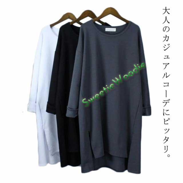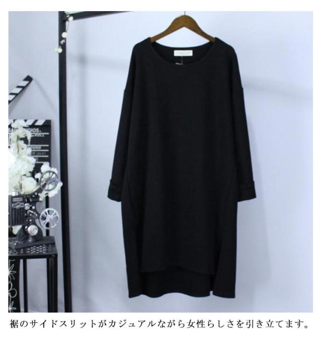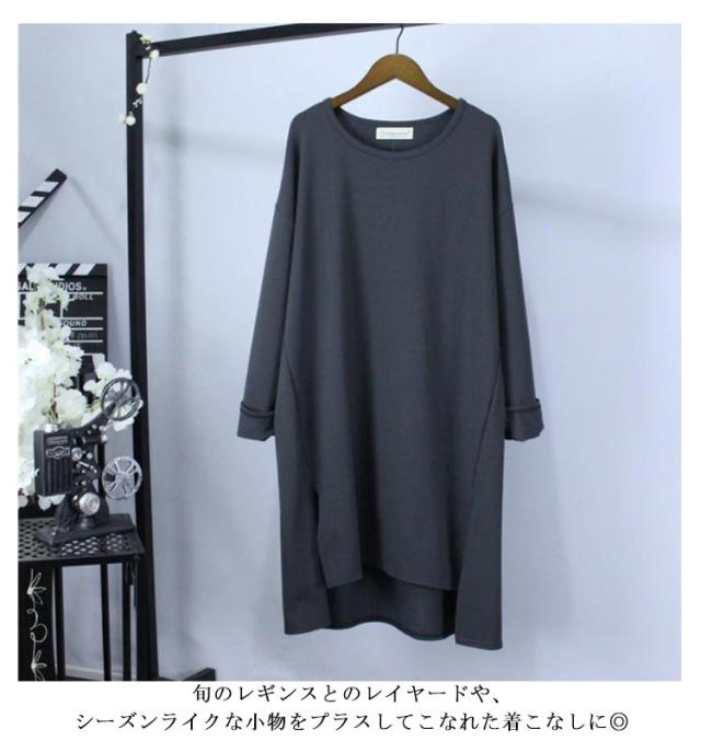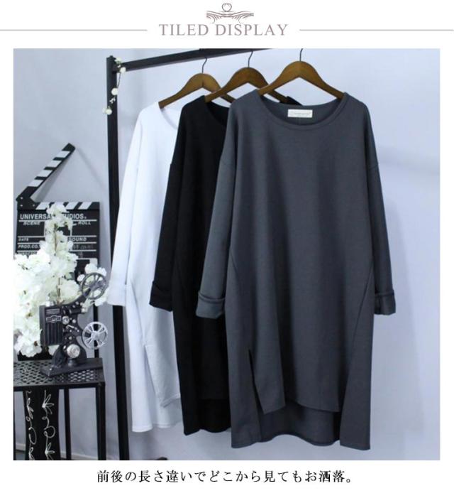 長袖Tシャツワンピース ワンピ tシャツワンピース ドロップショルダー 厚手 膝丈 スリット 長袖 不規則 クルーネック ボリューム袖 ルームウエア 無地 秋服 春服 ブラック 黒 ホワイト 黒 グレー
